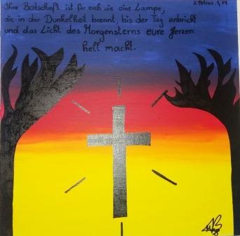 Gute Gründe, dass bereits die Teens dieses geistliche Anliegen teilten, zeigten sich mir beispielhaft in einem unserer Kreativ-Workshops. Beim „Malen Mixed Media“ gab sich ein Mädchen nicht damit zufrieden, bloß ein schönes Kunstwerk zu erstellen, vielmehr ging es ihr darum, damit wesentliche Glaubensinhalte zu vermitteln. So malte die erst 14-Jährige in den schillerndsten Farbtönen einen wunderschönen Sonnenaufgang, um dann auf dem oberen Teil des Bildes Auszüge von 2.Petrus 1,19 zu zitieren. Die Krönung stellte das Kreuz im Zentrum ihres Gemäldes dar: in Verbindung mit dem zitierten Bibelwort erschloss sich mir folgender Sinn: Jesus Christus ist als das fleischgewordene Wort das Licht in unserer Finsternis. Großartig, wenn ein Mensch dies in jungen Jahren bereits sagen kann! Dafür kann ich unserem Gott nur danken! Nur er kann es schenken, dass jemand „zur Erkenntnis der Wahrheit“ kommt und Jesus Christus als „das Licht der Welt“ entdeckt! Möge Er es schenken, dass dieses Bild vielen Menschen hilft, die Bedeutung des Kreuzes für ihr Leben herauszufinden. Bewegend für mich war auch zu sehen, wie ein weiteres Mädchen in dem erwähnten Workshop ihrer Sehnsucht nach Heil und einer neuen Welt Ausdruck verlieh: Auf ihrem Kunstwerk zitierte sie Auszüge von Offenbarung 21,1 (…einen neuen Himmel und eine neue Erde…).